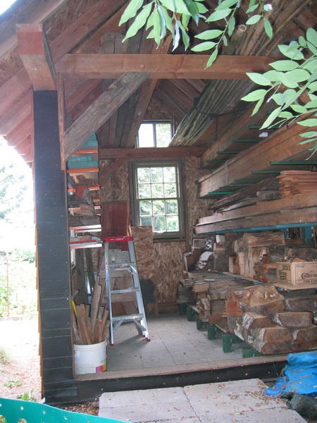 I started building my shed many years ago when I turned a 150' Douglas Fir into 6x6 and 6x8 timbers in anticipation of building a shed for storage of my chain saw harvested lumber. During 2006, I prepared the site for the shed and built a foundation platform for the shed. During the spring and summer of 2007, I prepared all the timbers needed to create a 9'x12' shed with 8' high side walls. On October 27, 2007, with the help of seven friends, we finally got the shed structure assembled and made preparations for the roof. Click here to see the photos of the construction process.